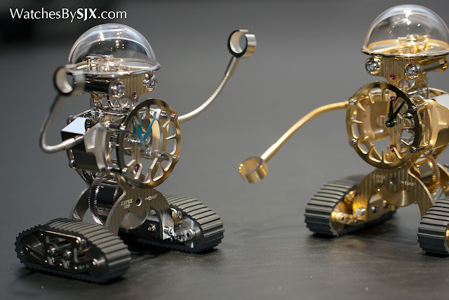 Hoogtepunten van de carré De onafhankelijken vochten de dappere strijd. Een van de meest succesvolle, MB & F , onthulde een kleine tafel klok vorm van een robot rijden op tank loopvlakken. Gedoopt Sherman , na de Tweede Wereldoorlog tank, de klok is een relatief betaalbaar SFr13,800, terwijl ook lief en geeky op een manier die alleen MB & F kan beheren. Aan de andere kant van het spectrum was de SFr350,000 MB & F HM6-SV, een versie van de organisch gevormde HM6 , nu uitgerust met een saffier kristal geval.